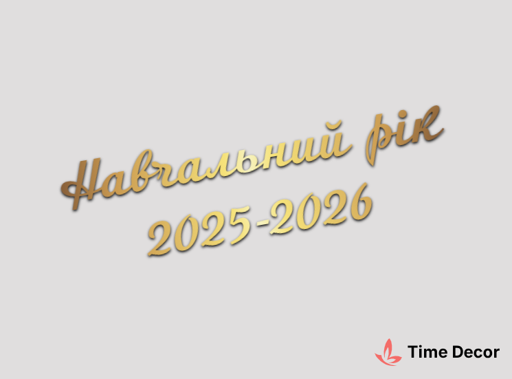 Пластиковий напис "Навчальний рік 2025-2026" – дзеркальний або матовий пластик, можливе виготовлення з клейкою зворотною поверхнею для легкого монтажу.