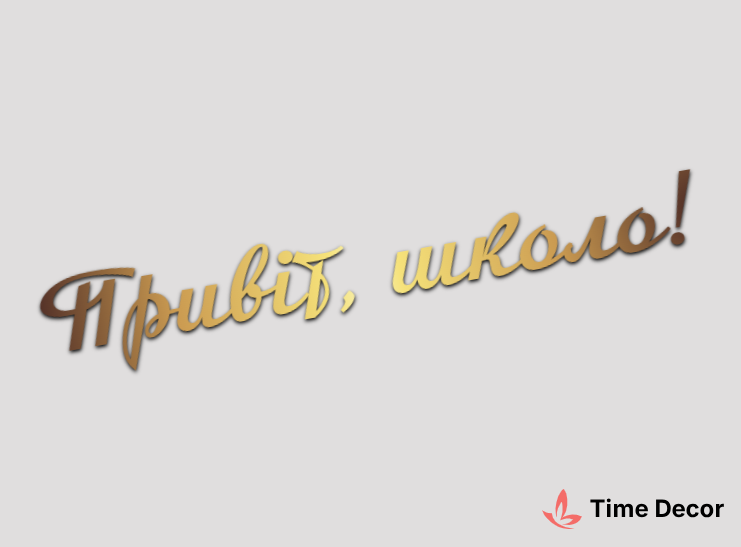 Пластиковий напис "Привіт, школо!" – дзеркальний або матовий пластик, можливе виготовлення з клейкою зворотною поверхнею для легкого монтажу.