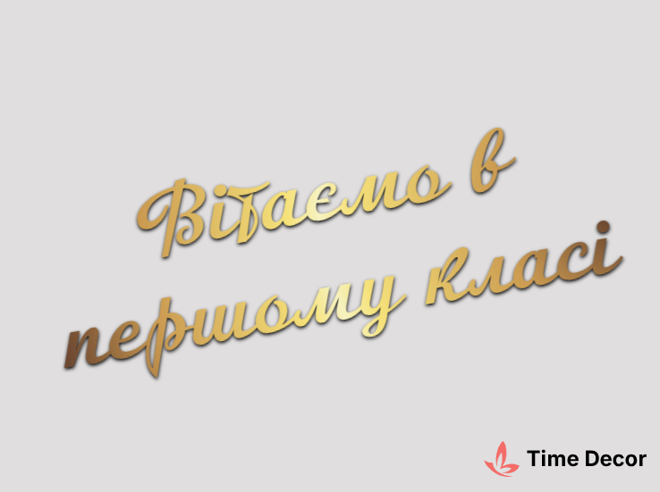 Пластиковий напис "Вітаємо в першому класі" – дзеркальний або матовий пластик, можливе виготовлення з клейкою зворотною поверхнею для легкого монтажу.