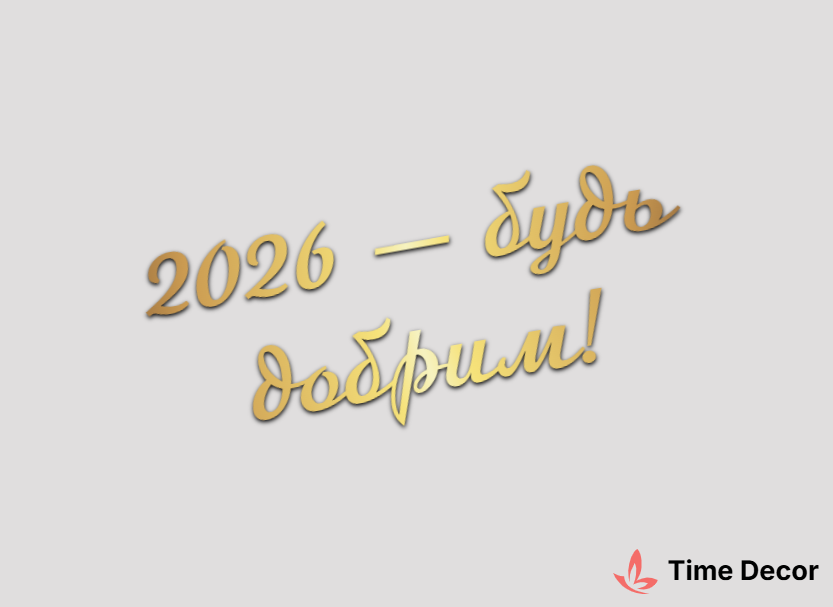 Пластиковий напис "2026 — будь добрим!" – дзеркальний або матовий пластик, можливе виготовлення з клейкою зворотною поверхнею для легкого монтажу.