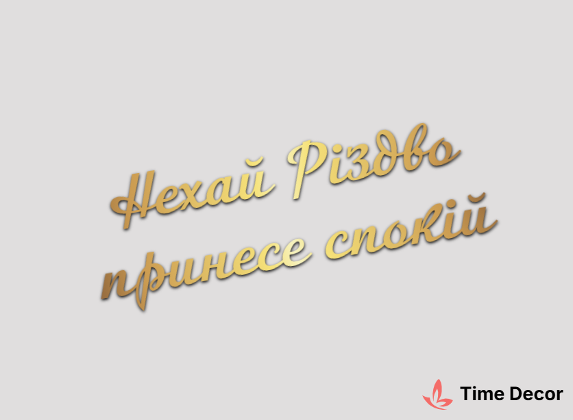 Пластиковий напис "Нехай Різдво принесе спокій" – дзеркальний або матовий пластик, можливе виготовлення з клейкою зворотною поверхнею для легкого монтажу.