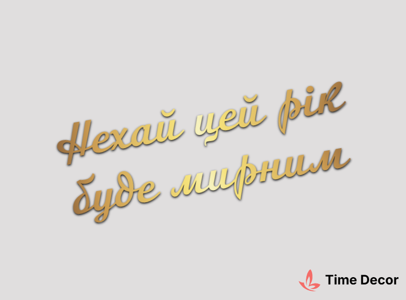 Пластиковий напис "Нехай цей рік буде мирним" – дзеркальний або матовий пластик, можливе виготовлення з клейкою зворотною поверхнею для легкого монтажу.