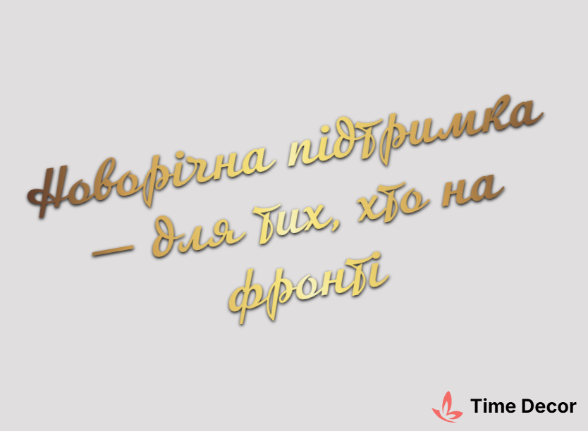 Пластиковий напис "Новорічна підтримка — для тих, хто на фронті" – дзеркальний або матовий пластик, можливе виготовлення з клейкою зворотною поверхнею для легкого монтажу.