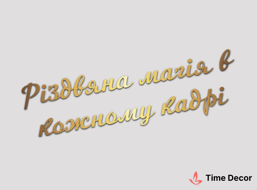 Пластиковий напис "Різдвяна магія в кожному кадрі" – дзеркальний або матовий пластик, можливе виготовлення з клейкою зворотною поверхнею для легкого монтажу.