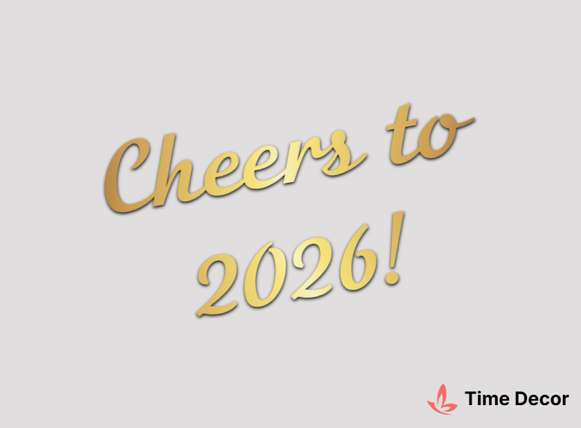 Пластиковий напис "Cheers to 2026!" – дзеркальний або матовий пластик, можливе виготовлення з клейкою зворотною поверхнею для легкого монтажу.