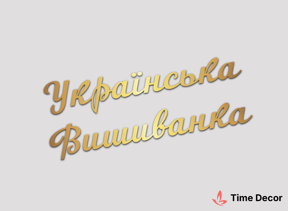 Пластиковий напис "Українська Вишиванка" – дзеркальний або матовий пластик, можливе виготовлення з клейкою зворотною поверхнею для легкого монтажу.