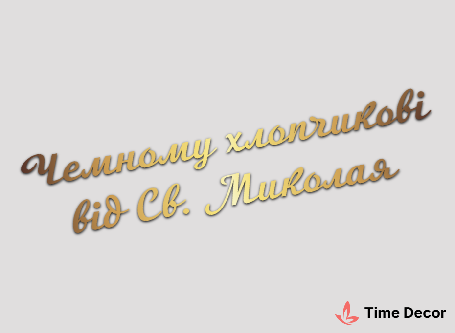 Пластиковий напис "Чемному хлопчикові від Св. Миколая" – дзеркальний або матовий пластик, можливе виготовлення з клейкою зворотною поверхнею для легкого монтажу.