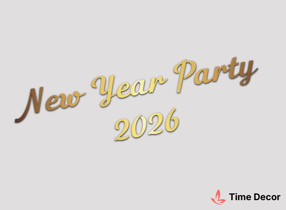Пластиковий напис "New Year Party 2026" – дзеркальний або матовий пластик, можливе виготовлення з клейкою зворотною поверхнею для легкого монтажу.