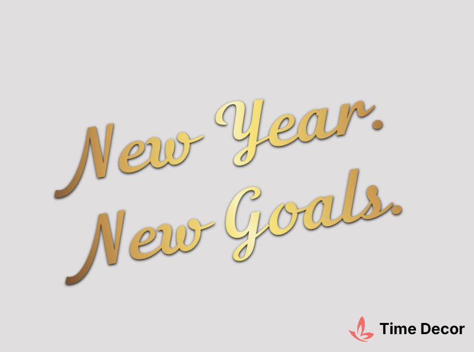 Пластиковий напис "New Year. New Goals." – дзеркальний або матовий пластик, можливе виготовлення з клейкою зворотною поверхнею для легкого монтажу.