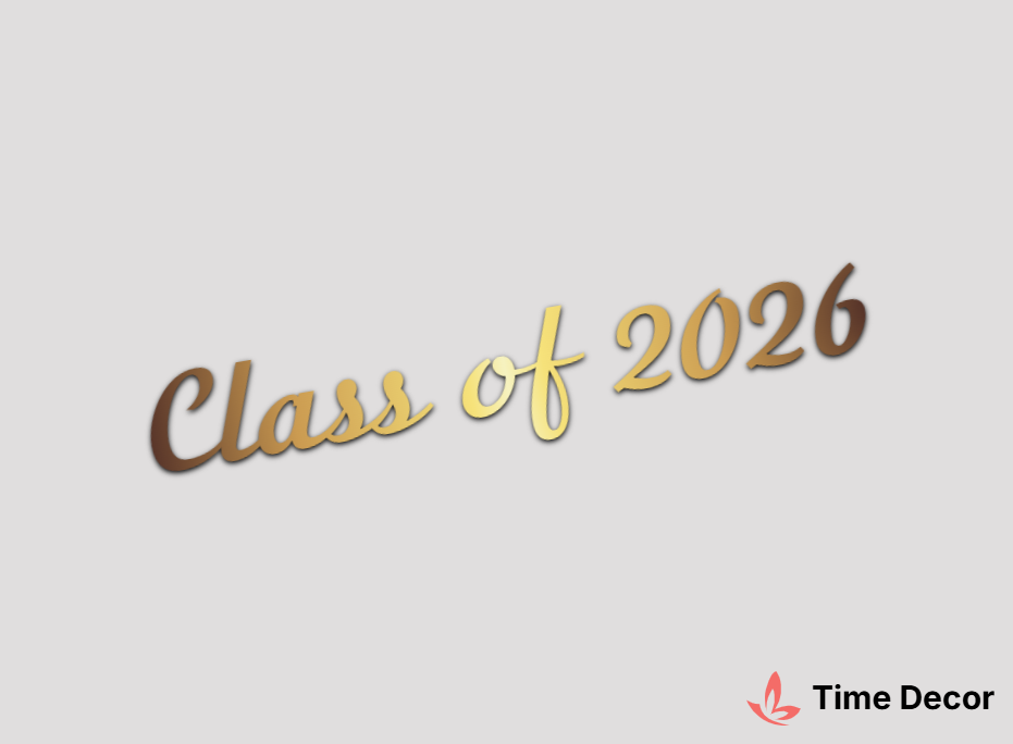 Пластиковий напис "Class of 2026" – дзеркальний або матовий пластик, можливе виготовлення з клейкою зворотною поверхнею для легкого монтажу.