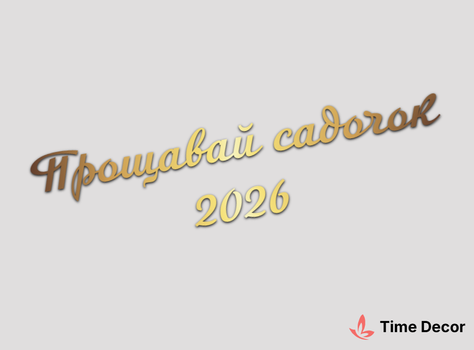 Пластиковий напис "Прощавай садочок 2026" – дзеркальний або матовий пластик, можливе виготовлення з клейкою зворотною поверхнею для легкого монтажу.