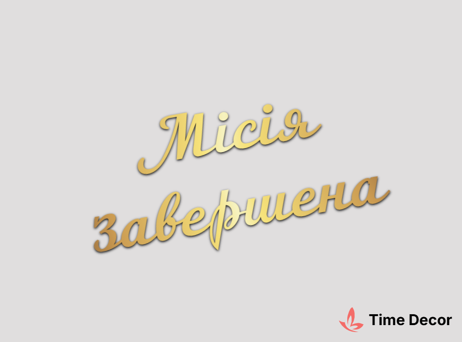 Пластиковий напис "Місія завершена" – дзеркальний або матовий пластик, можливе виготовлення з клейкою зворотною поверхнею для легкого монтажу.