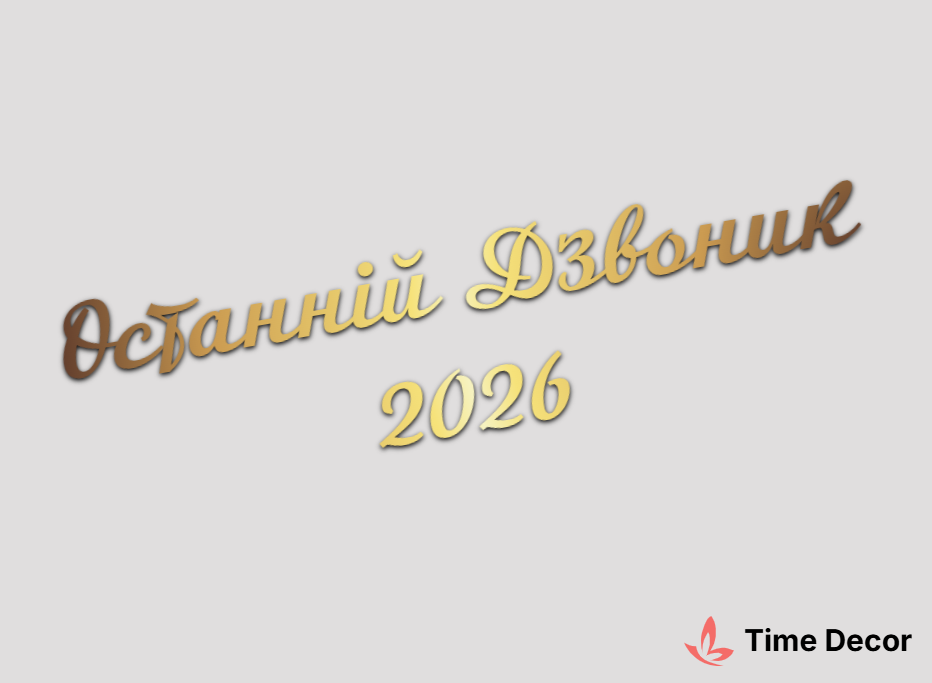 Пластиковий напис "Останній Дзвоник 2026" – дзеркальний або матовий пластик, можливе виготовлення з клейкою зворотною поверхнею для легкого монтажу.