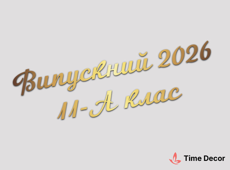 Пластиковий напис "Випускний 2026 11-А клас" – дзеркальний або матовий пластик, можливе виготовлення з клейкою зворотною поверхнею для легкого монтажу.