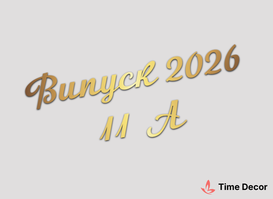Пластиковий напис "Випуск 2026 11 А" – дзеркальний або матовий пластик, можливе виготовлення з клейкою зворотною поверхнею для легкого монтажу.