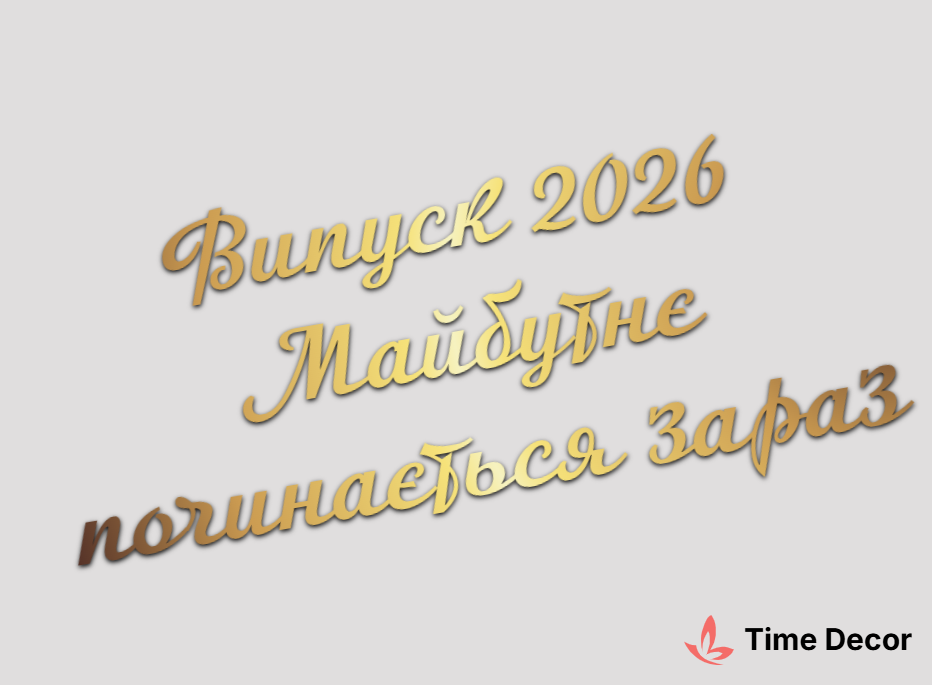 Пластиковий напис "Випуск 2026 Майбутнє починається зараз" – дзеркальний або матовий пластик, можливе виготовлення з клейкою зворотною поверхнею для легкого монтажу.