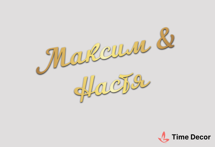 Пластиковий напис "Максим & Настя" – дзеркальний або матовий пластик, можливе виготовлення з клейкою зворотною поверхнею для легкого монтажу.