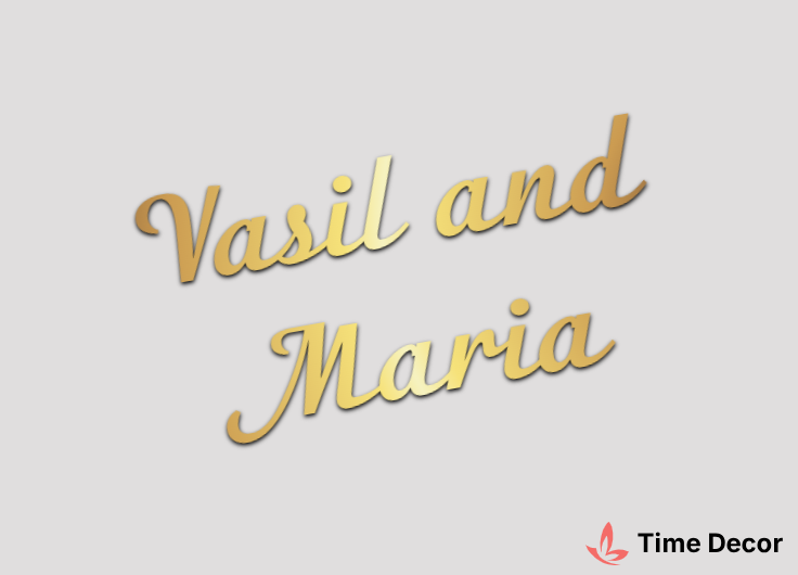 Пластиковий напис "Vasil and Maria" – дзеркальний або матовий пластик, можливе виготовлення з клейкою зворотною поверхнею для легкого монтажу.