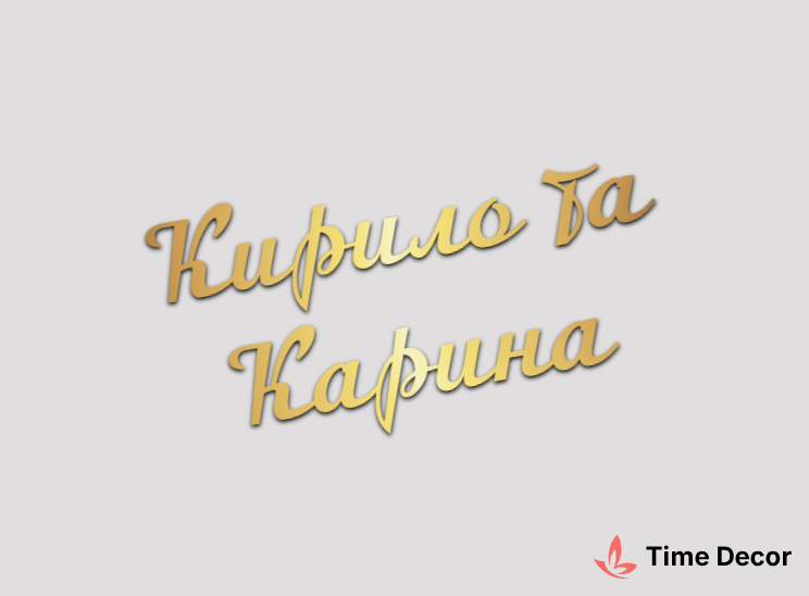 Пластиковий напис "Кирило та Карина" – дзеркальний або матовий пластик, можливе виготовлення з клейкою зворотною поверхнею для легкого монтажу.
