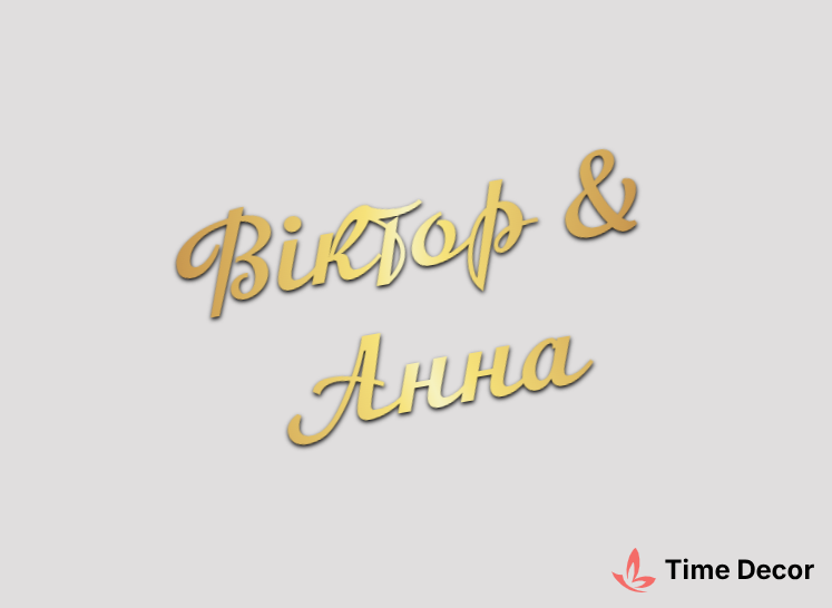 Пластиковий напис "Віктор & Анна" – дзеркальний або матовий пластик, можливе виготовлення з клейкою зворотною поверхнею для легкого монтажу.