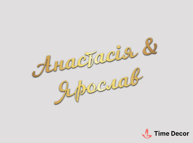 Пластиковий напис "Анастасія & Ярослав" – дзеркальний або матовий пластик, можливе виготовлення з клейкою зворотною поверхнею для легкого монтажу.