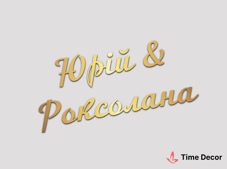 Пластиковий напис "Юрій & Роксолана" – дзеркальний або матовий пластик, можливе виготовлення з клейкою зворотною поверхнею для легкого монтажу.