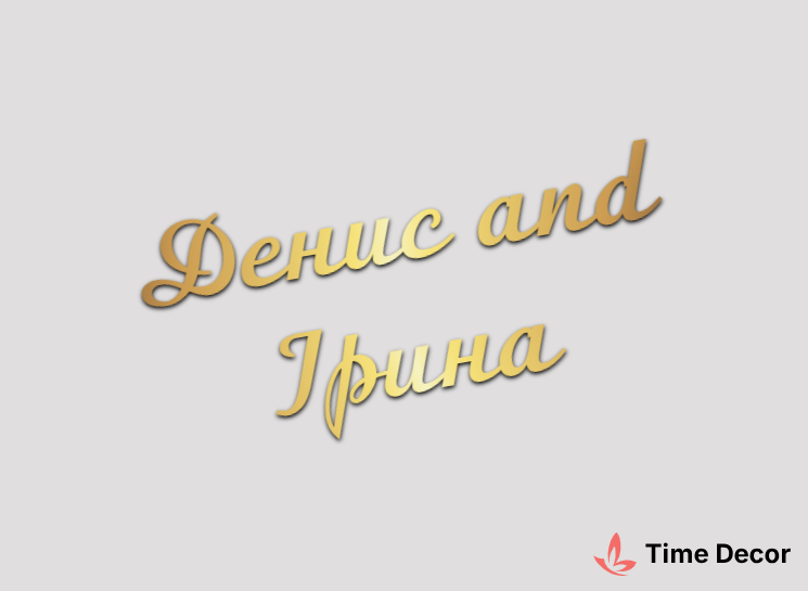 Пластиковий напис "Денис and Ірина" – дзеркальний або матовий пластик, можливе виготовлення з клейкою зворотною поверхнею для легкого монтажу.
