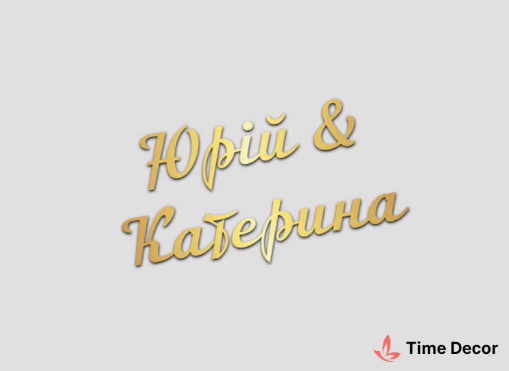 Пластиковий напис "Юрій & Катерина" – дзеркальний або матовий пластик, можливе виготовлення з клейкою зворотною поверхнею для легкого монтажу.