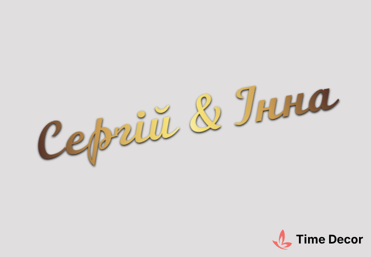 Пластиковий напис "Сергій & Інна" – дзеркальний або матовий пластик, можливе виготовлення з клейкою зворотною поверхнею для легкого монтажу.