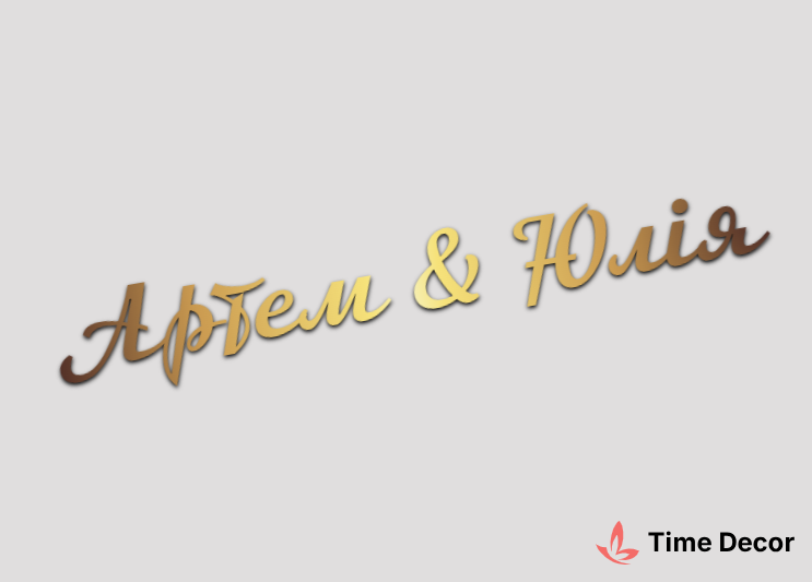 Пластиковий напис "Артем & Юлія" – дзеркальний або матовий пластик, можливе виготовлення з клейкою зворотною поверхнею для легкого монтажу.