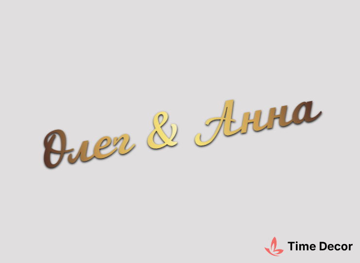 Пластиковий напис "Олег & Анна" – дзеркальний або матовий пластик, можливе виготовлення з клейкою зворотною поверхнею для легкого монтажу.