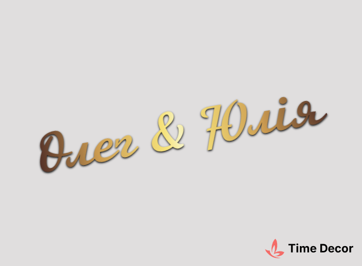 Пластиковий напис "Олег & Юлія" – дзеркальний або матовий пластик, можливе виготовлення з клейкою зворотною поверхнею для легкого монтажу.