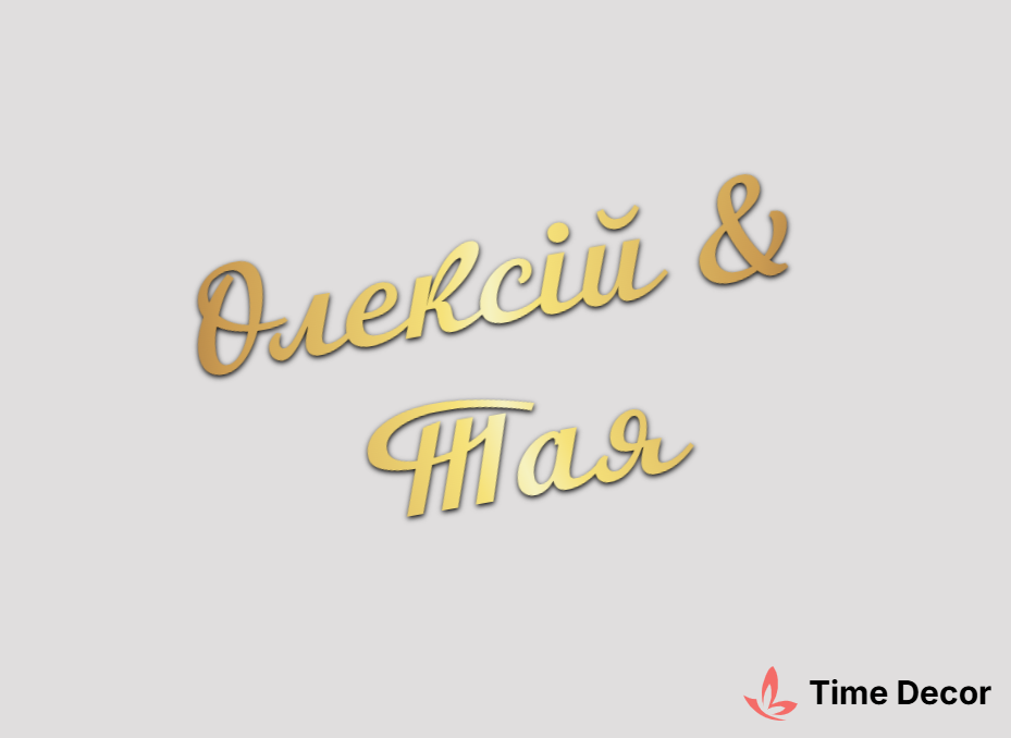 Пластиковий напис "Олексій & Тая" – дзеркальний або матовий пластик, можливе виготовлення з клейкою зворотною поверхнею для легкого монтажу.
