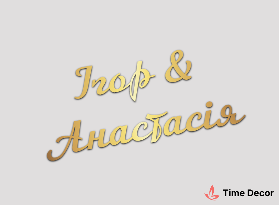 Пластиковий напис "Ігор & Анастасія" – дзеркальний або матовий пластик, можливе виготовлення з клейкою зворотною поверхнею для легкого монтажу.