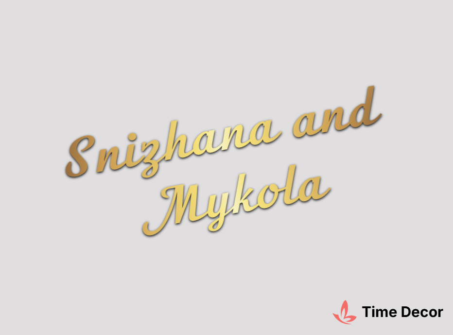 Пластиковий напис "Snizhana and Mykola" – дзеркальний або матовий пластик, можливе виготовлення з клейкою зворотною поверхнею для легкого монтажу.
