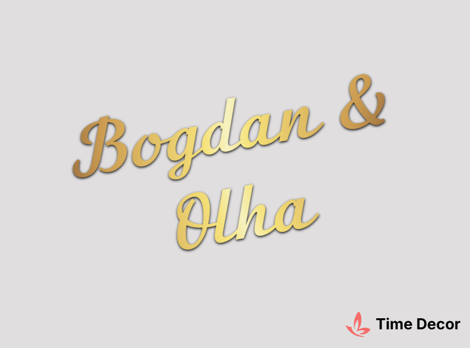 Пластиковий напис "Bogdan & Olha" – дзеркальний або матовий пластик, можливе виготовлення з клейкою зворотною поверхнею для легкого монтажу.
