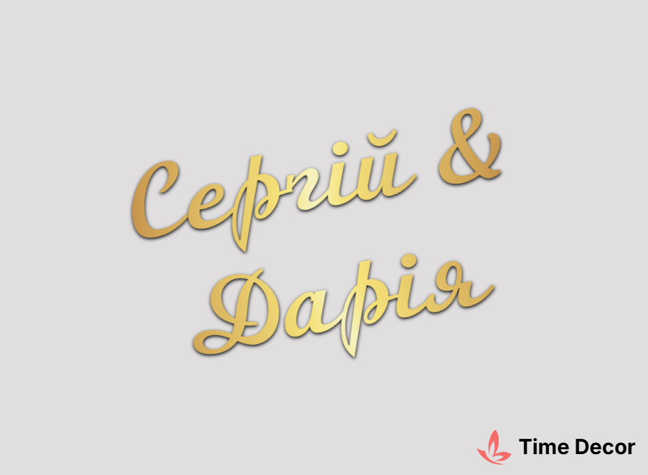 Пластиковий напис "Сергій & Дарія" – дзеркальний або матовий пластик, можливе виготовлення з клейкою зворотною поверхнею для легкого монтажу.