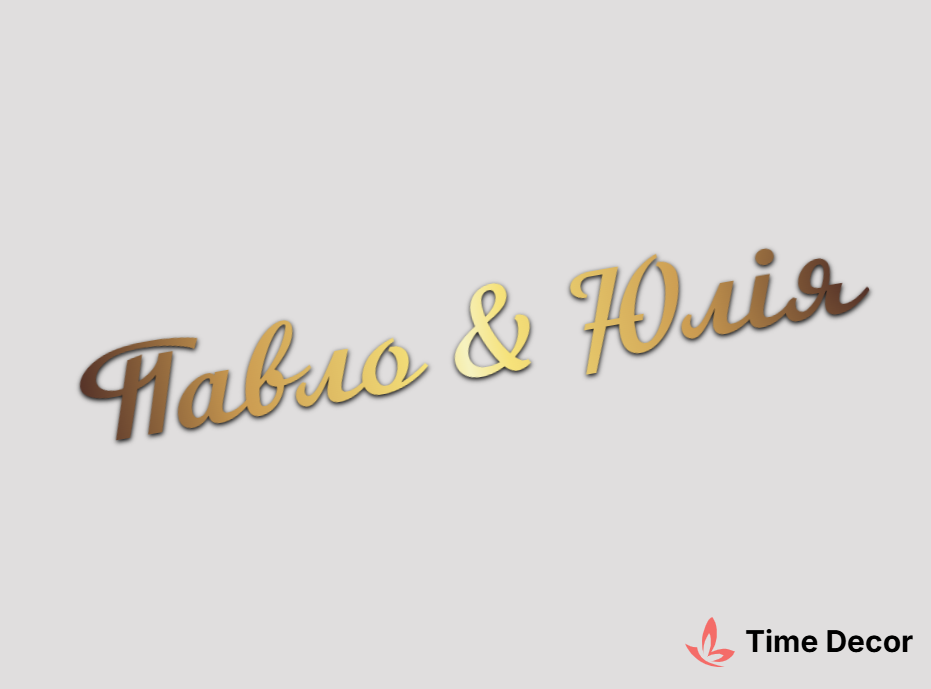 Пластиковий напис "Павло & Юлія" – дзеркальний або матовий пластик, можливе виготовлення з клейкою зворотною поверхнею для легкого монтажу.