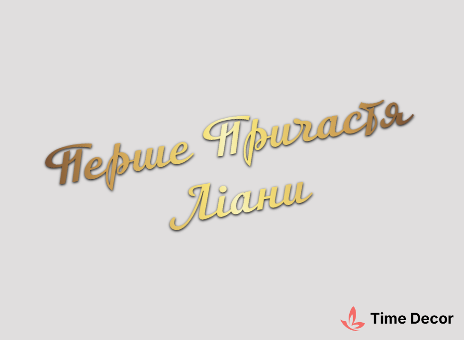Пластиковий напис "Перше Причастя Ліани" – дзеркальний або матовий пластик, можливе виготовлення з клейкою зворотною поверхнею для легкого монтажу.