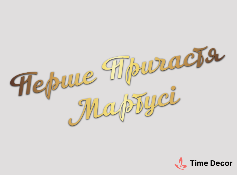 Пластиковий напис "Перше Причастя Мартусі" – дзеркальний або матовий пластик, можливе виготовлення з клейкою зворотною поверхнею для легкого монтажу.