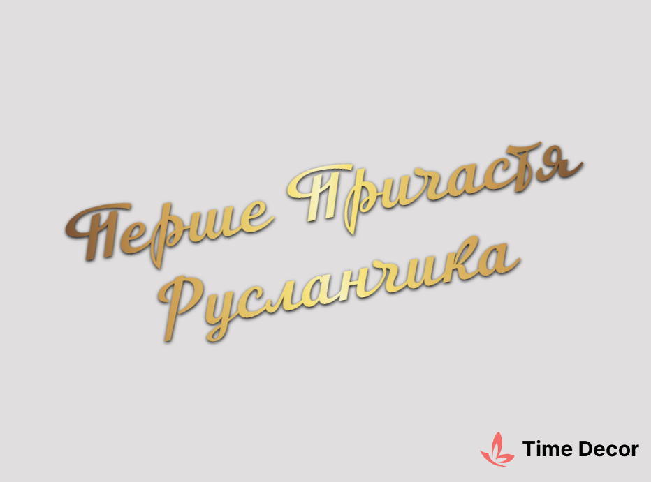 Пластиковий напис "Перше Причастя Русланчика" – дзеркальний або матовий пластик, можливе виготовлення з клейкою зворотною поверхнею для легкого монтажу.