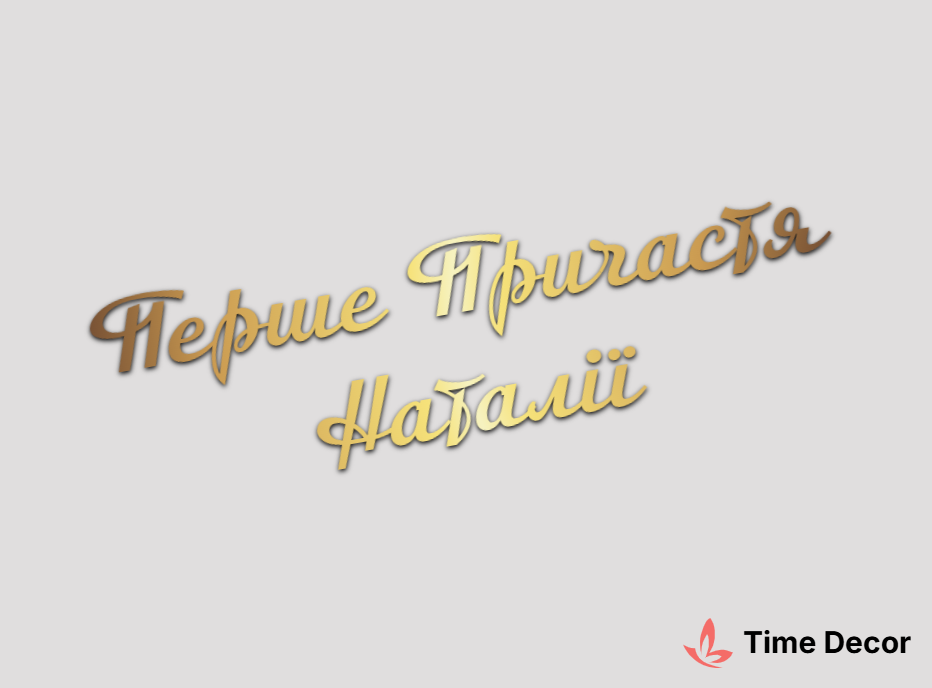 Пластиковий напис "Перше Причастя Наталії" – дзеркальний або матовий пластик, можливе виготовлення з клейкою зворотною поверхнею для легкого монтажу.