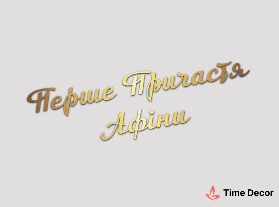 Пластиковий напис "Перше Причастя Афіни" – дзеркальний або матовий пластик, можливе виготовлення з клейкою зворотною поверхнею для легкого монтажу.