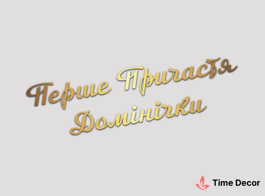 Пластиковий напис "Перше Причастя Домінічки" – дзеркальний або матовий пластик, можливе виготовлення з клейкою зворотною поверхнею для легкого монтажу.