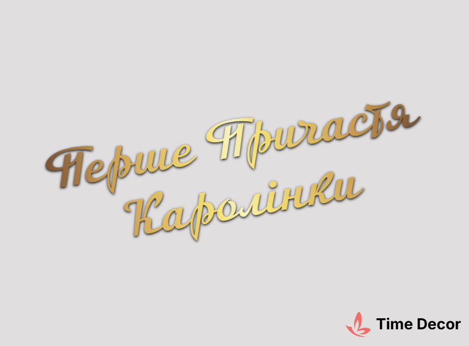 Пластиковий напис "Перше Причастя Каролінки" – дзеркальний або матовий пластик, можливе виготовлення з клейкою зворотною поверхнею для легкого монтажу.