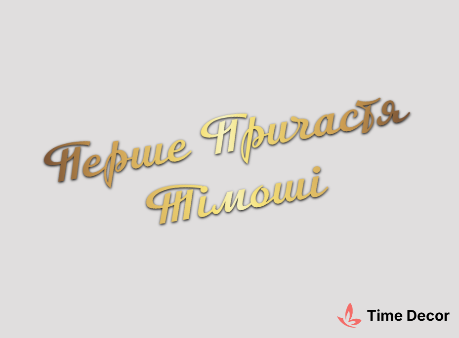 Пластиковий напис "Перше Причастя Тімоші" – дзеркальний або матовий пластик, можливе виготовлення з клейкою зворотною поверхнею для легкого монтажу.