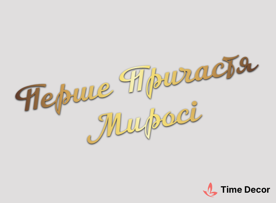 Пластиковий напис "Перше Причастя Миросі" – дзеркальний або матовий пластик, можливе виготовлення з клейкою зворотною поверхнею для легкого монтажу.