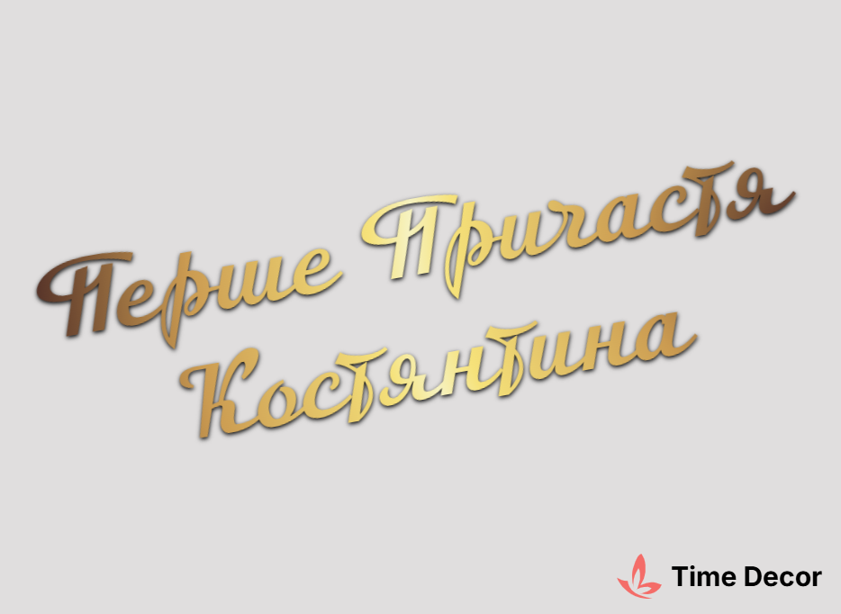 Пластиковий напис "Перше Причастя Костянтина" – дзеркальний або матовий пластик, можливе виготовлення з клейкою зворотною поверхнею для легкого монтажу.
