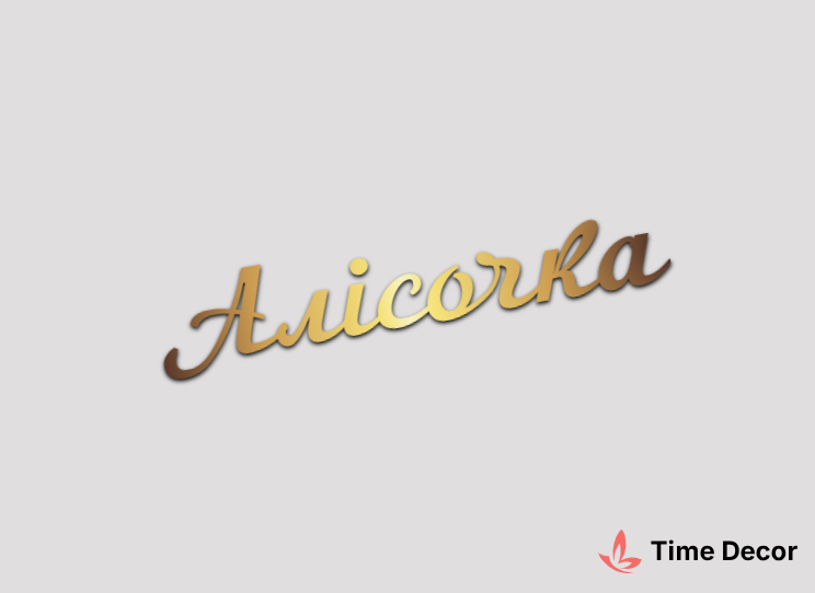Пластиковий напис "Алісочка" – дзеркальний або матовий пластик, можливе виготовлення з клейкою зворотною поверхнею для легкого монтажу.