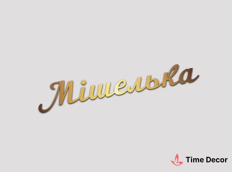 Пластиковий напис "Мiшелька" – дзеркальний або матовий пластик, можливе виготовлення з клейкою зворотною поверхнею для легкого монтажу.